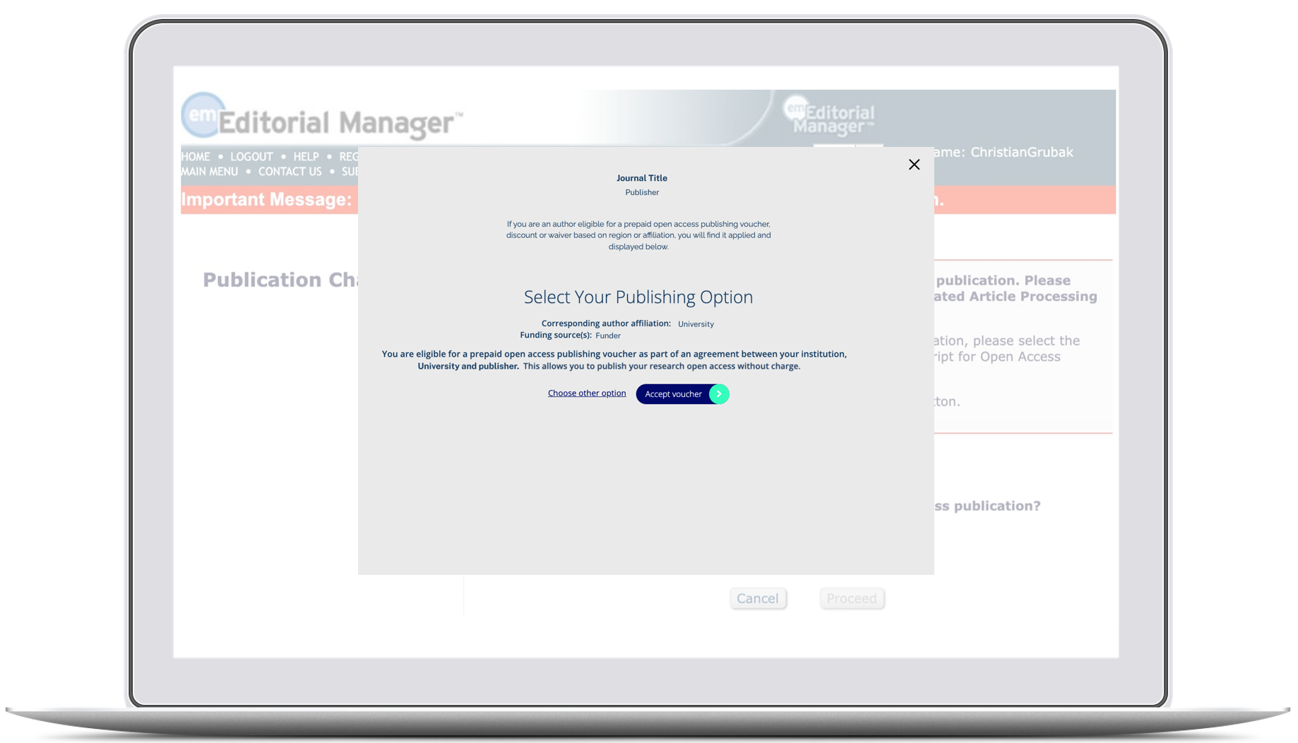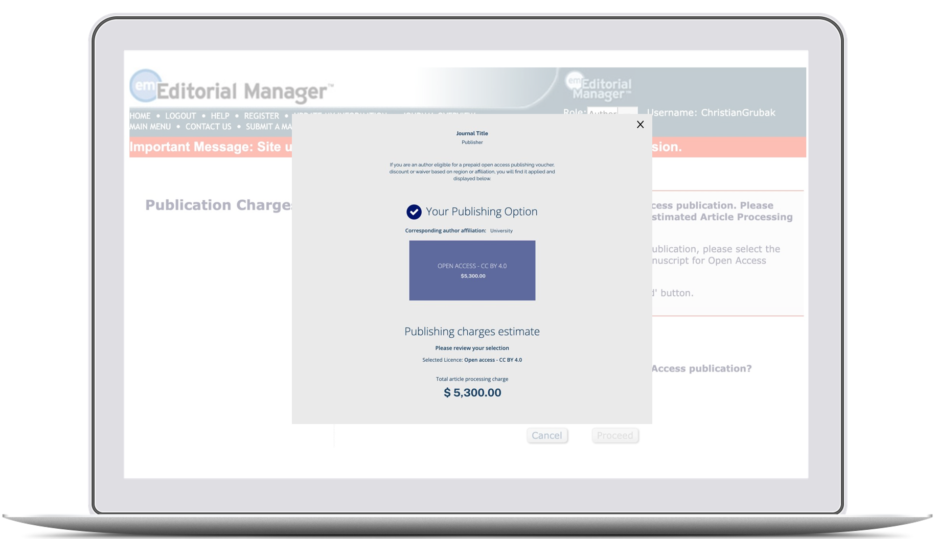 Powered by ChronosHub, where the APC pricing, Read & Publish agreements, discounts, and waivers are held, options will be presented to authors directly within EM, providing clear price transparency and the ability to accept a quotation upon initial manuscript submission.