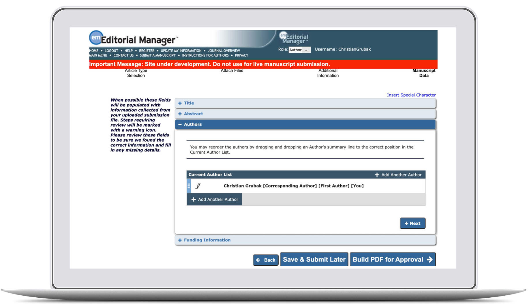 Upon choosing a journal in the ChronosHub Journal Finder, the author is brought to the manuscript submission page through the Editorial Manager integration. To begin the submission, the author is guided smoothly through the first step which involves simply putting in all relevant information about the manuscript – this includes article type, title, abstract, affiliated authors, and funding information.