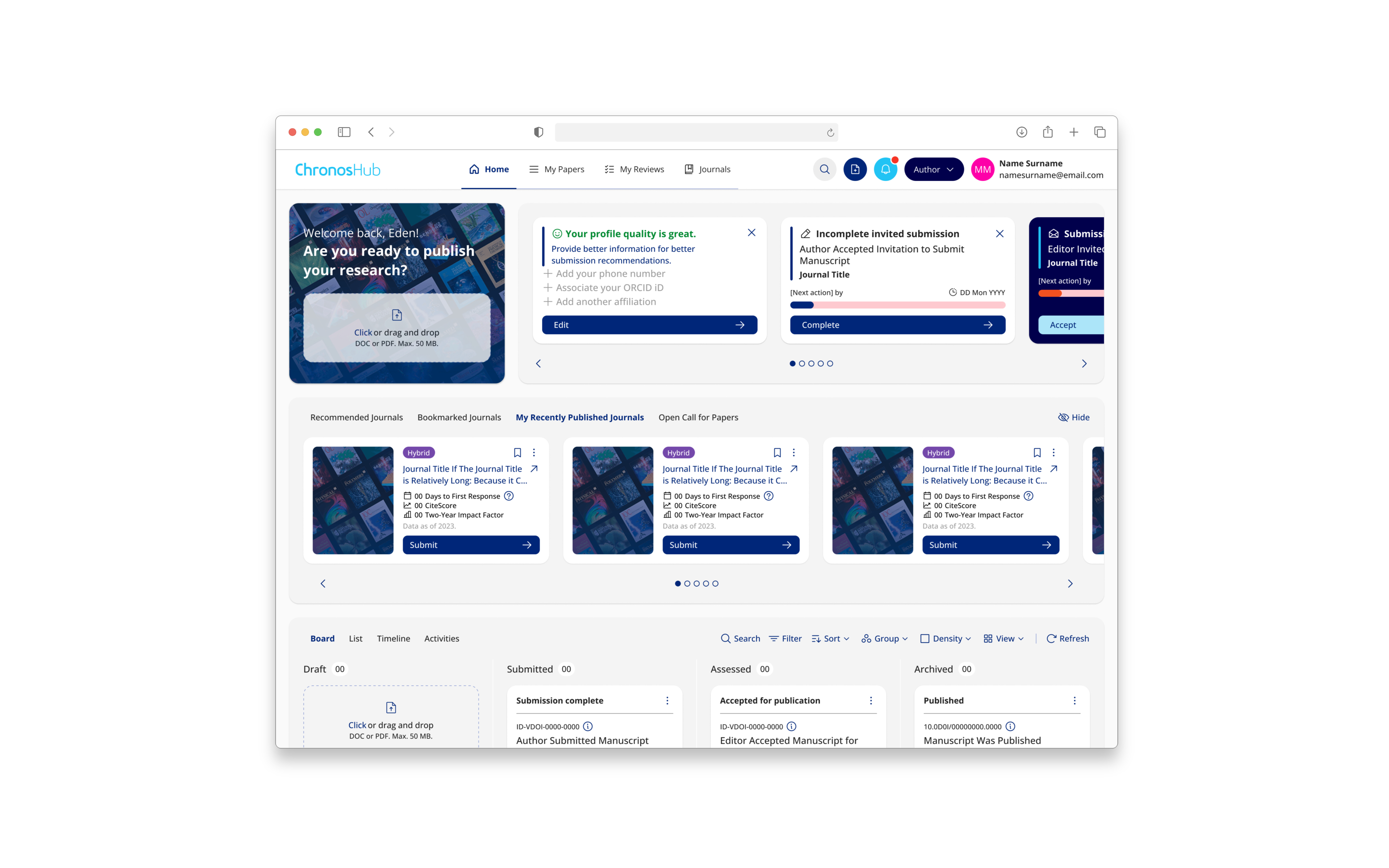 ChronosHub creates a unified experience that strengthens your brand and streamlines every stage of the publishing journey. From submission to post-acceptance processes, we ensure efficiency and ease, allowing authors to focus on what matters most—sharing their research with the world.