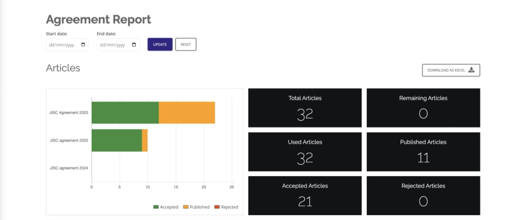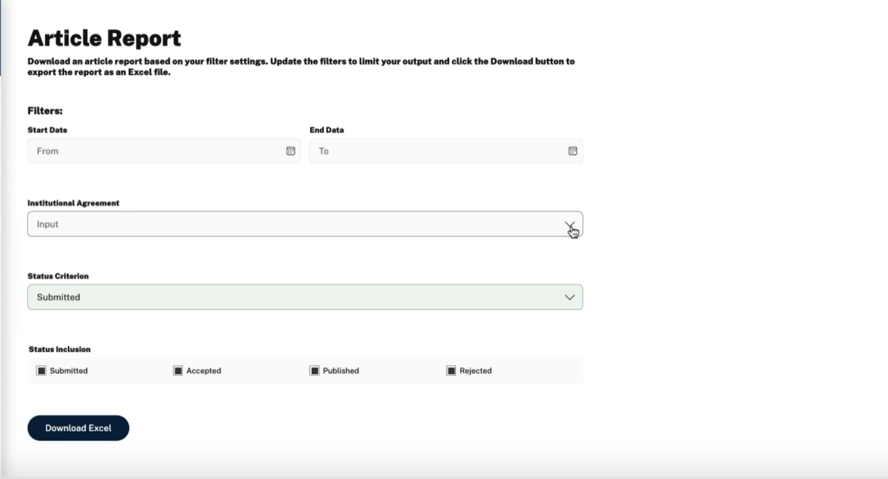 View all articles that include an author affiliated with your organisation and see where they are in the publishing process, from submitted to published. This includes articles published open access via an agreement, open access outside of an agreement, and closed access. The report can be filtered by agreement inclusion and can be downloaded in Excel.