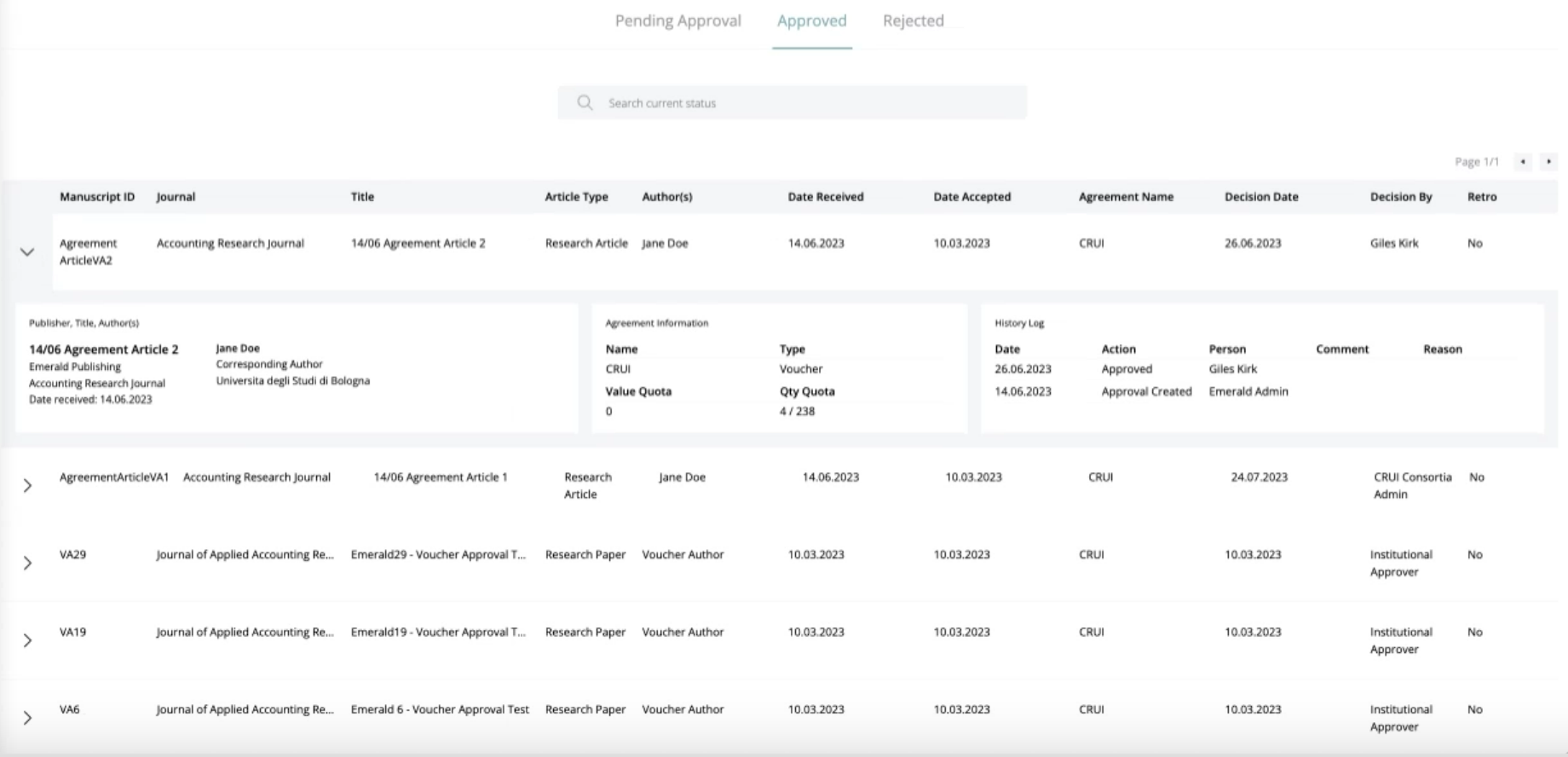 The Approval Dashboard allows administrators to see all accepted articles for their organisation, leave notes, and approve or reject an article as part of the agreement. Approvers receive email notifications if a new articles requires approval. Once approved, the article is passed to the author.