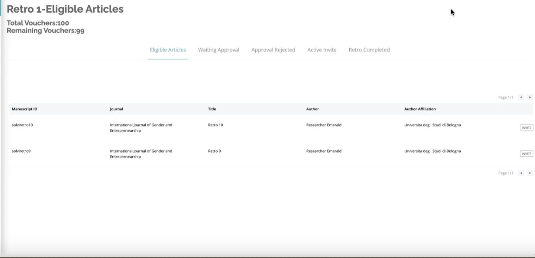 Overview of all articles that are eligible to be converted from closed to open access via an agreement. You can invite authors back into the process to resign their publishing license and convert the open access status of their articles.
